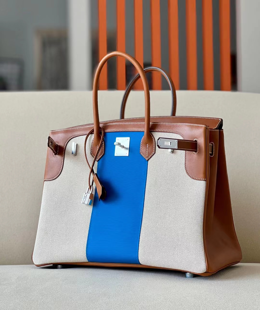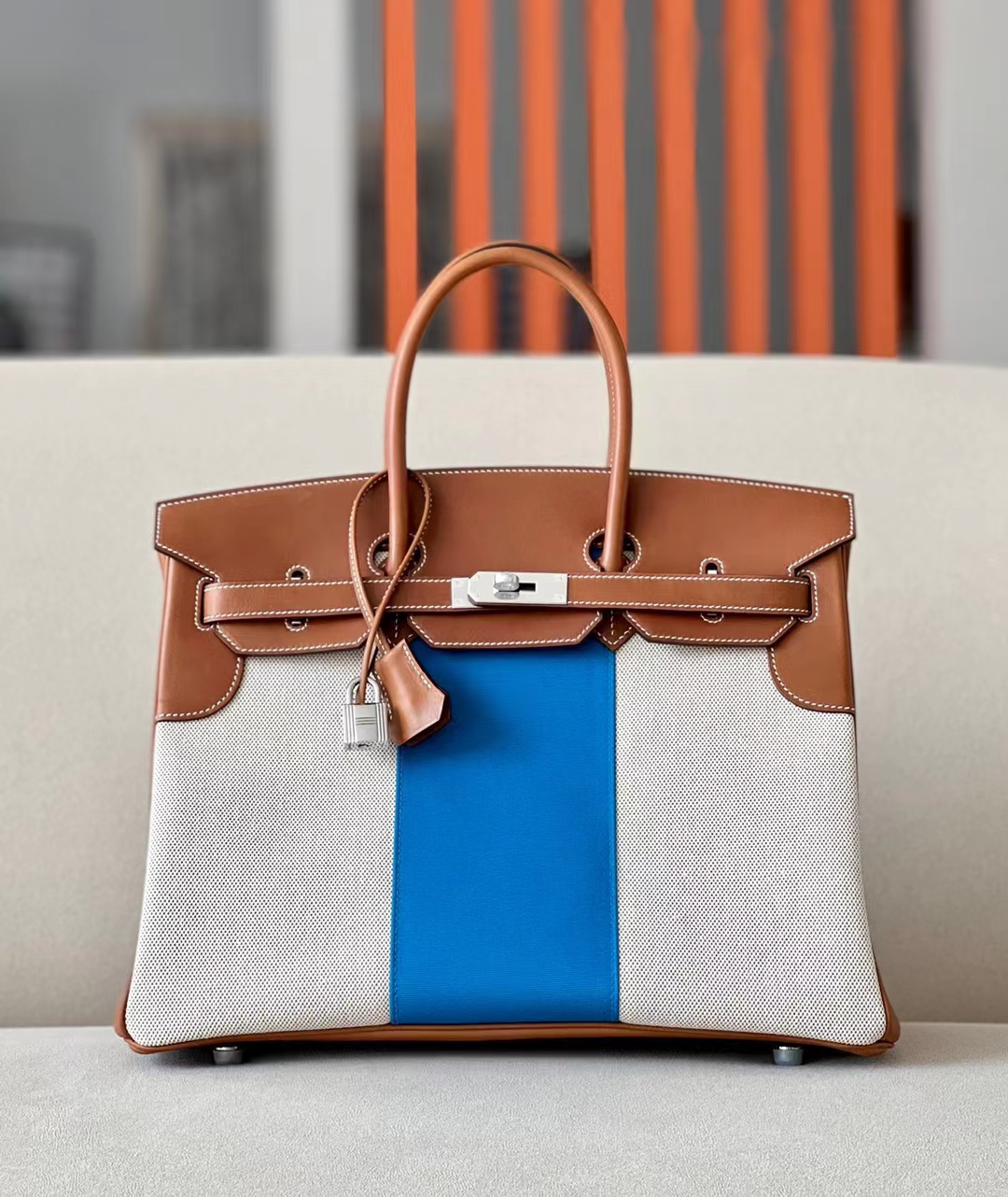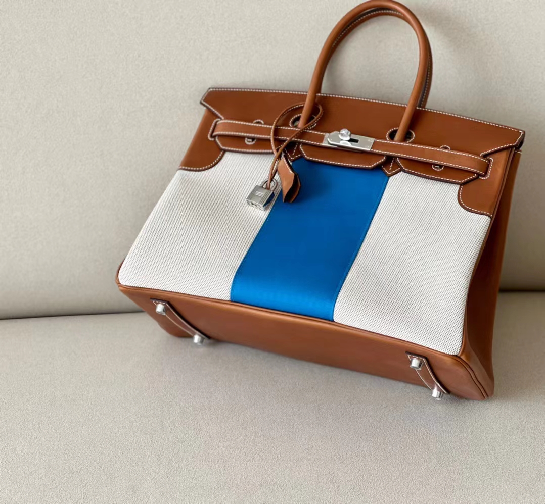 DesignerReps Birkin GARGO canvas & Barenia Brown & White & Blue Silver Hardware 35cm Full Handmade