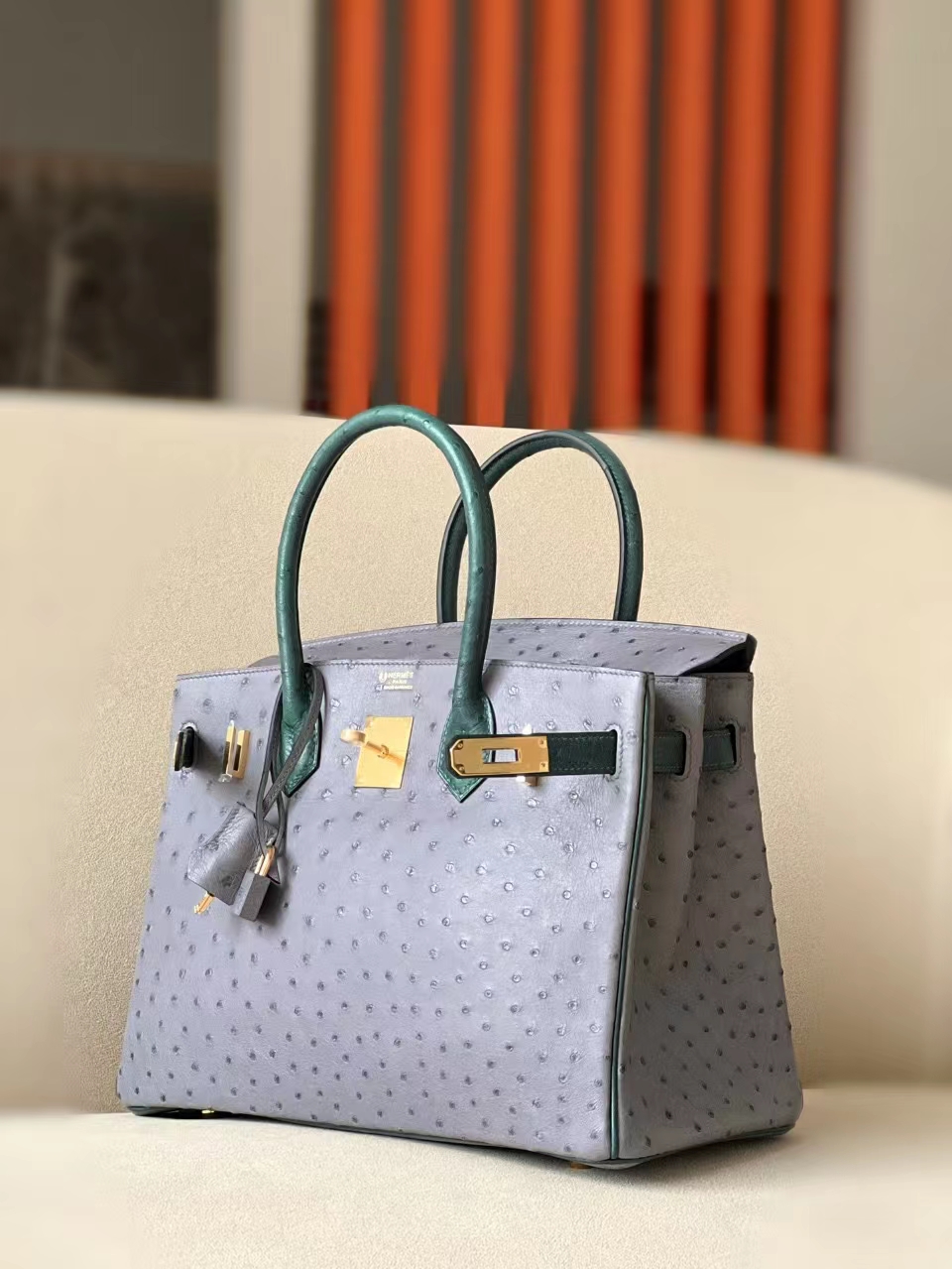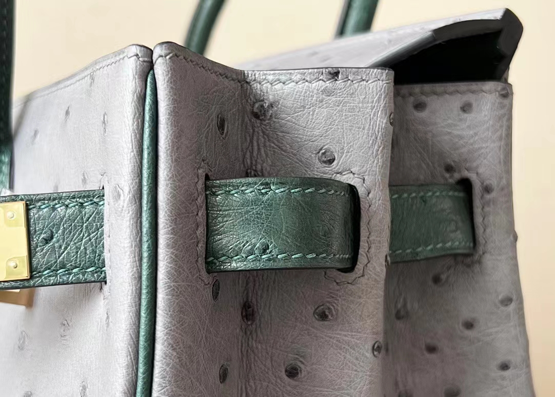 DesignerReps Birkin Ostrich Leather 82 Agate grey & 1T Deep Green Gold Hardware 30cm Full Handmade