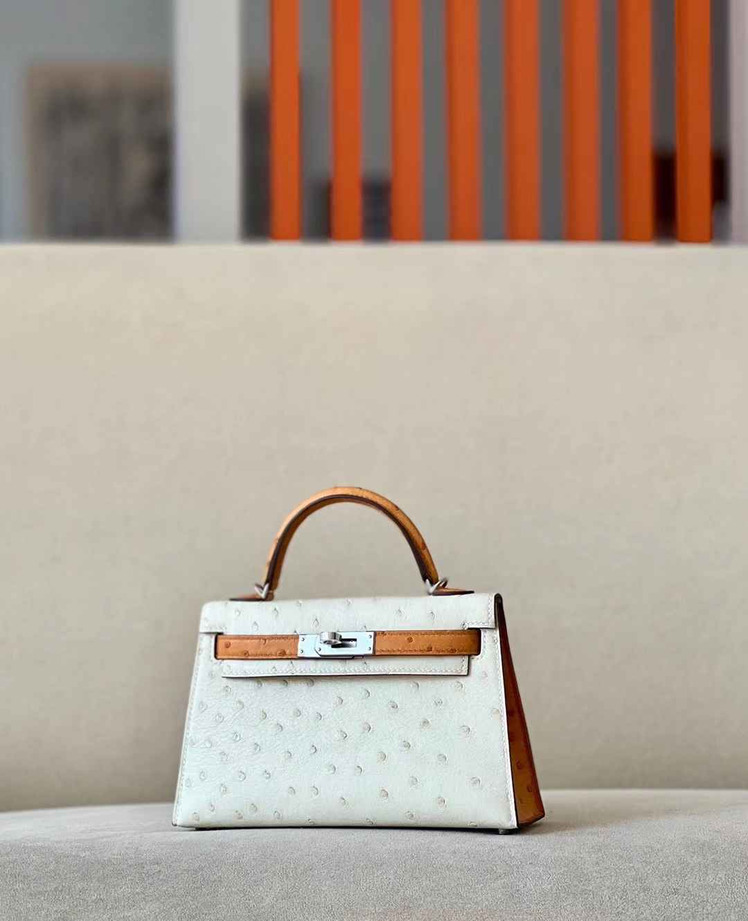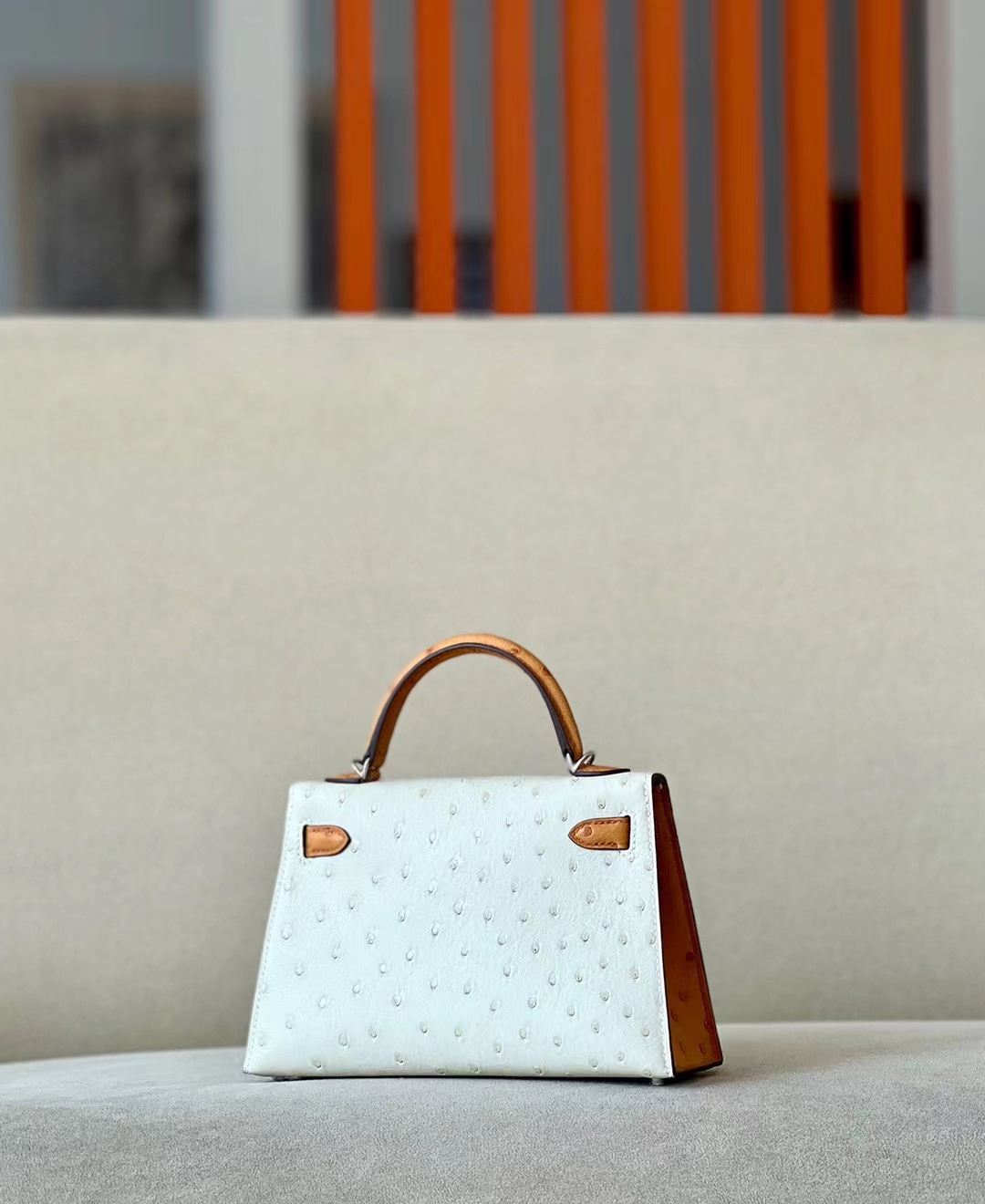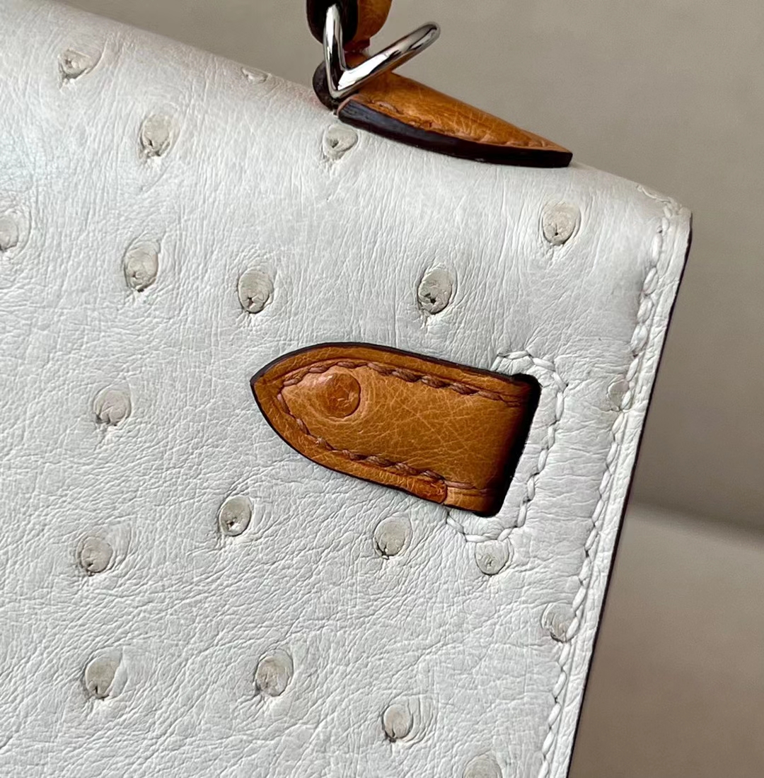 DesignerReps Mini Kelly Ostrich 8L Ice White & 22 Desert color Silver Hardware 19cm Full Handmade