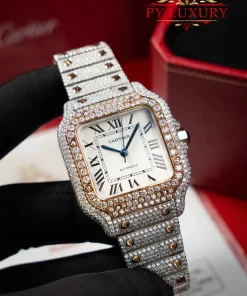 Cartier Santos Medium Model Two Tone Rose Gold Iced Out Moissanite 1:1 Best Replica 35.1mm