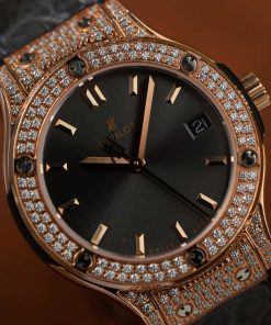 Hublot Classic Fusion King Gold Pavé CZ Stones Grey Dial Leather Strap Lady Watch Replica 33mm