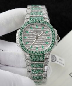 Patek Philippe Ladies Natilus 7118/1453G-001 Iced Out Moissanite Green Best Replica 35.2mm