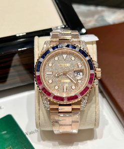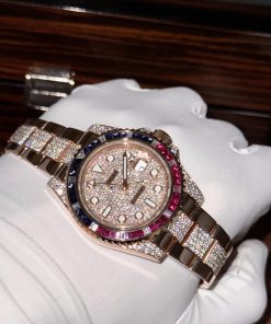 Rolex GMT-Master II 126755SARU 18K Gold Wrapped Moissanite Pavé Dial Ruby & Sapphire Bezel 40mm