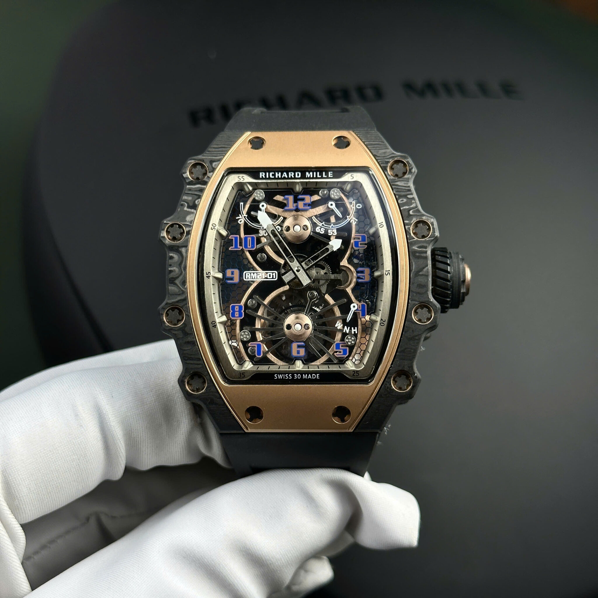 - Case Material: Stainless Steel – Gold PVD Coating – Carbon Fiber
