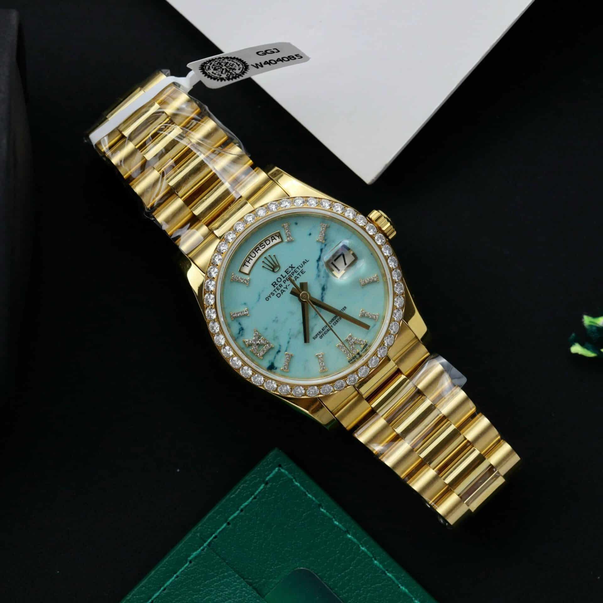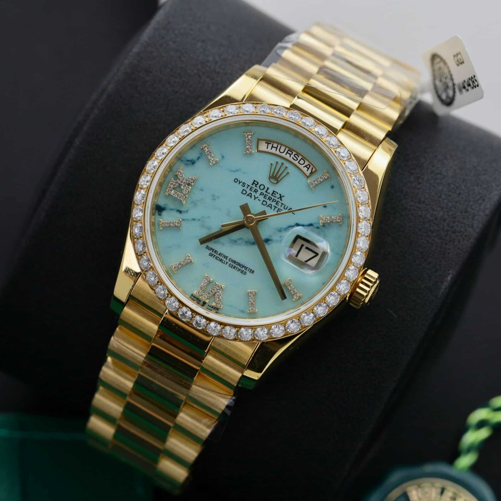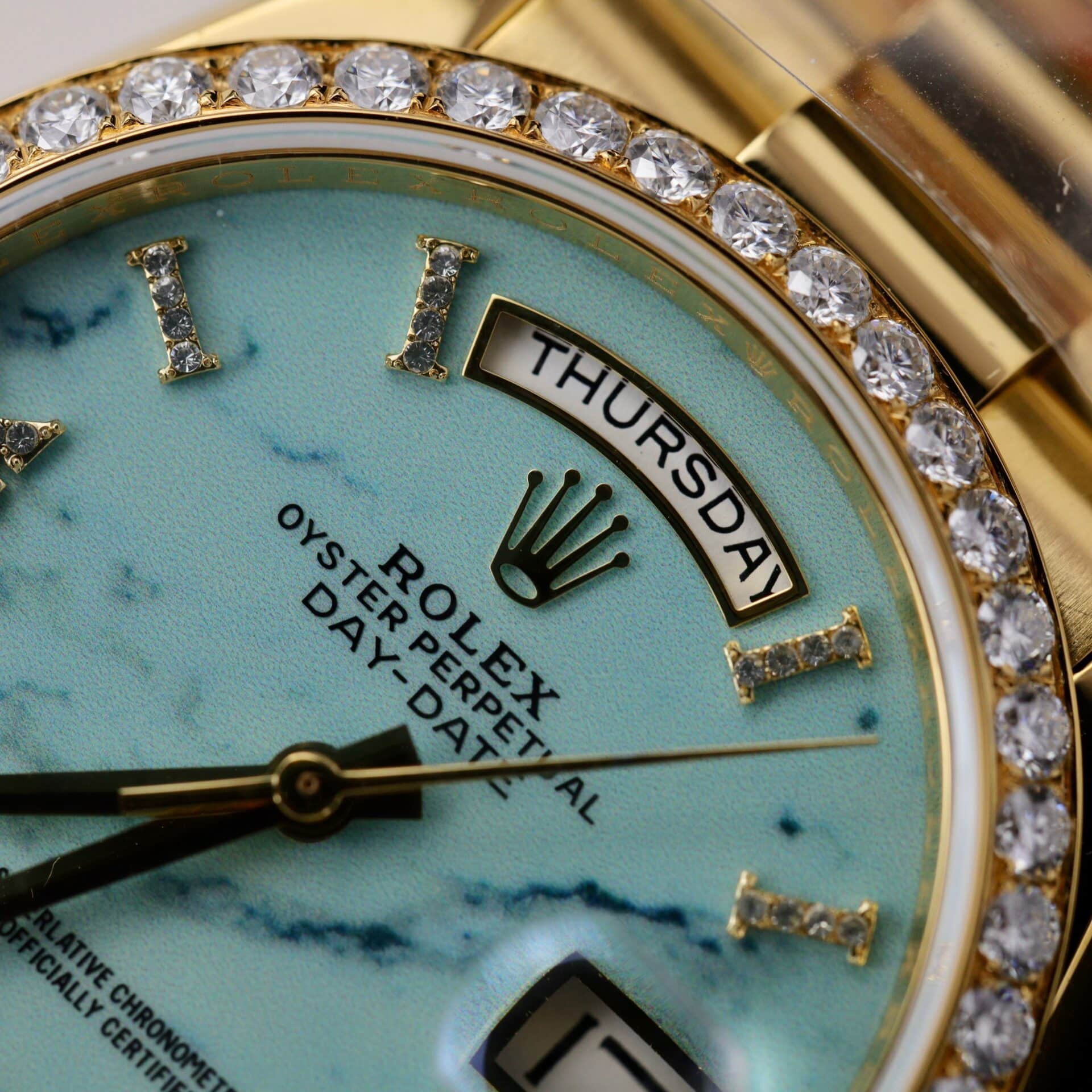 Rolex Day-Date 128348RBR-0037 Turquoise Dial 18K Yellow Gold Wrapped Moissanite Bezel 36mm