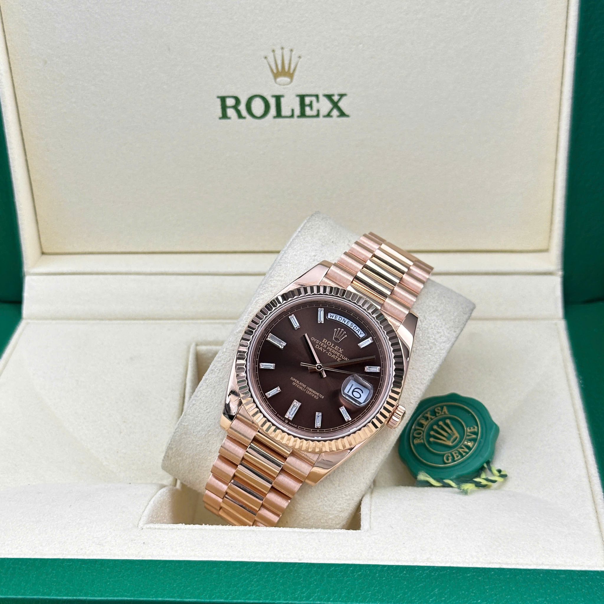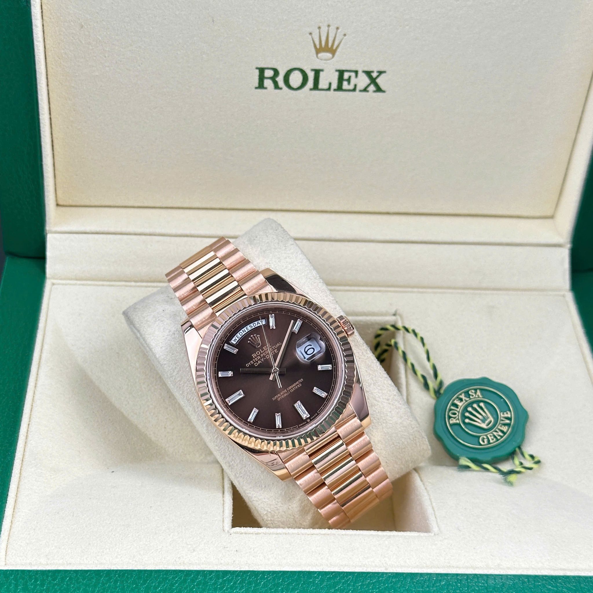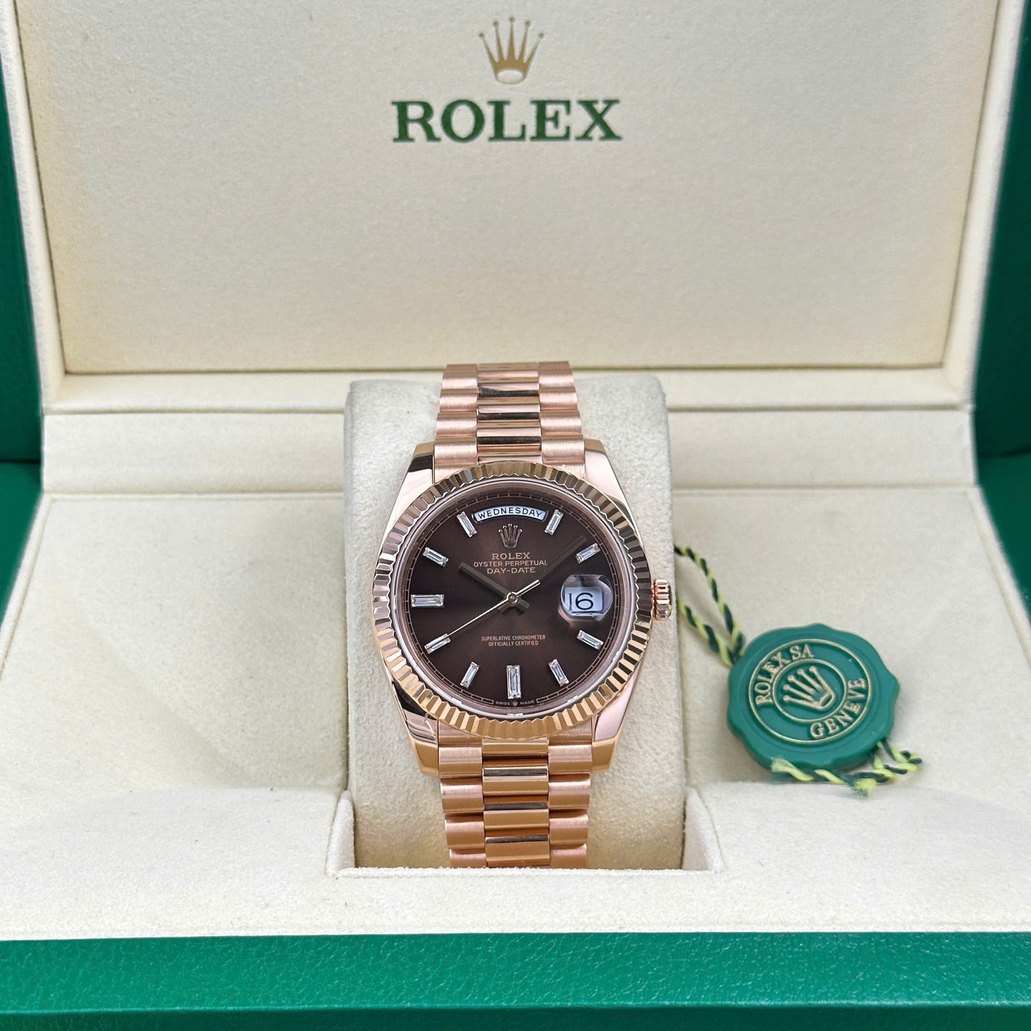 Rolex Day-Date 228235-0003 Chocolate Baguette Diamond Dial 18K Solid Rose Gold 40mm