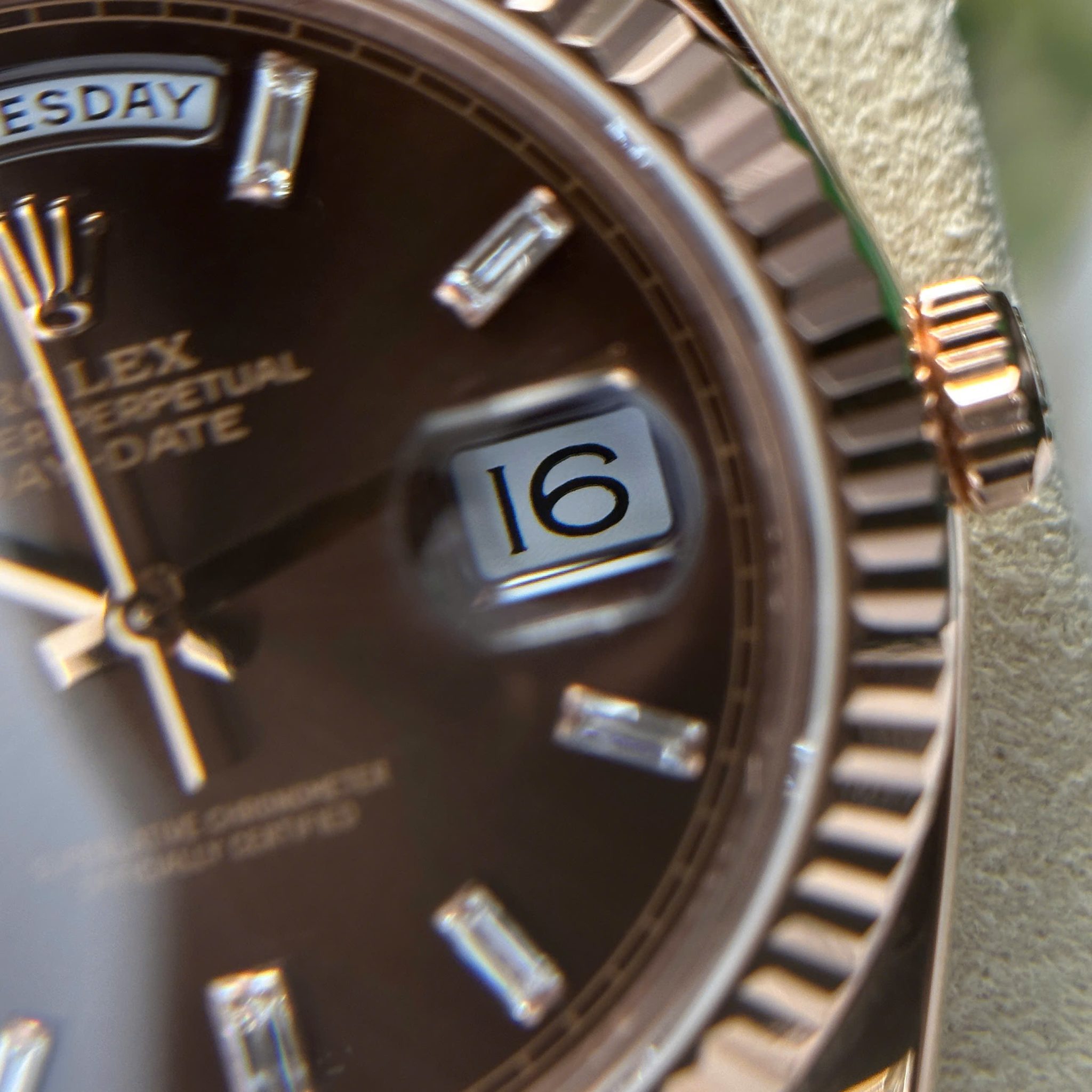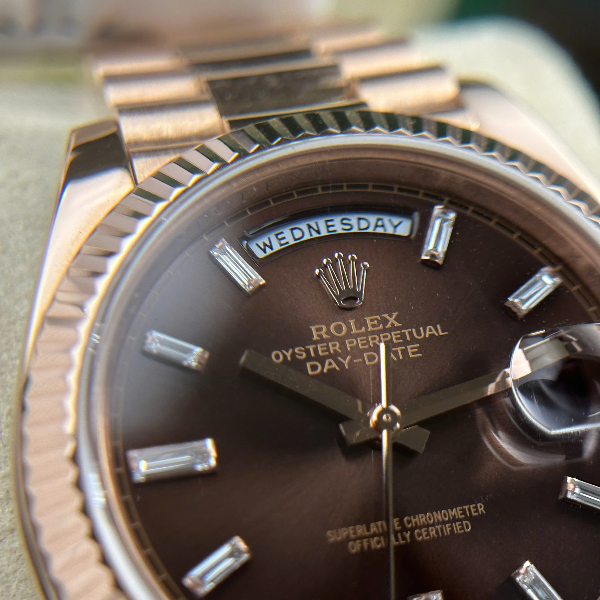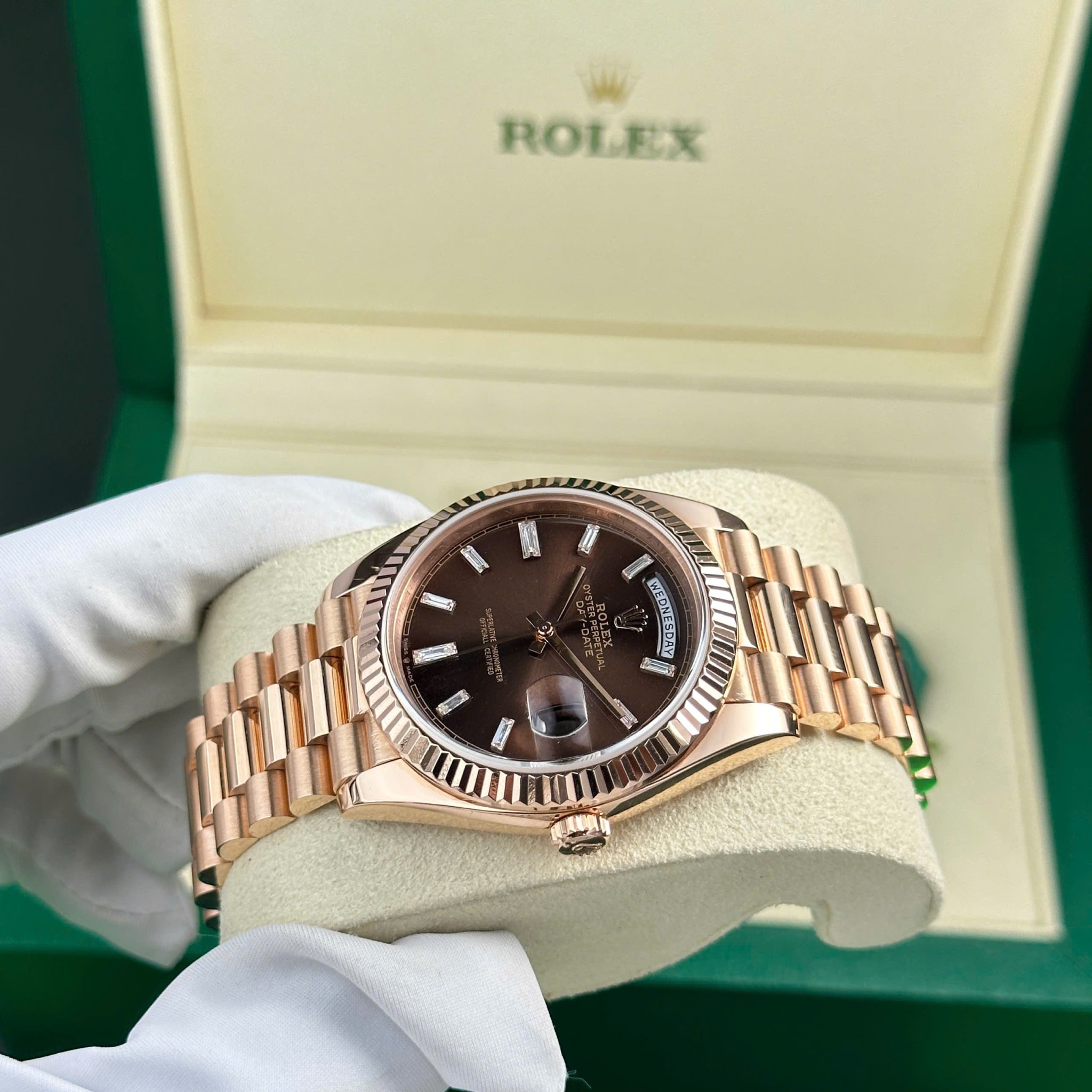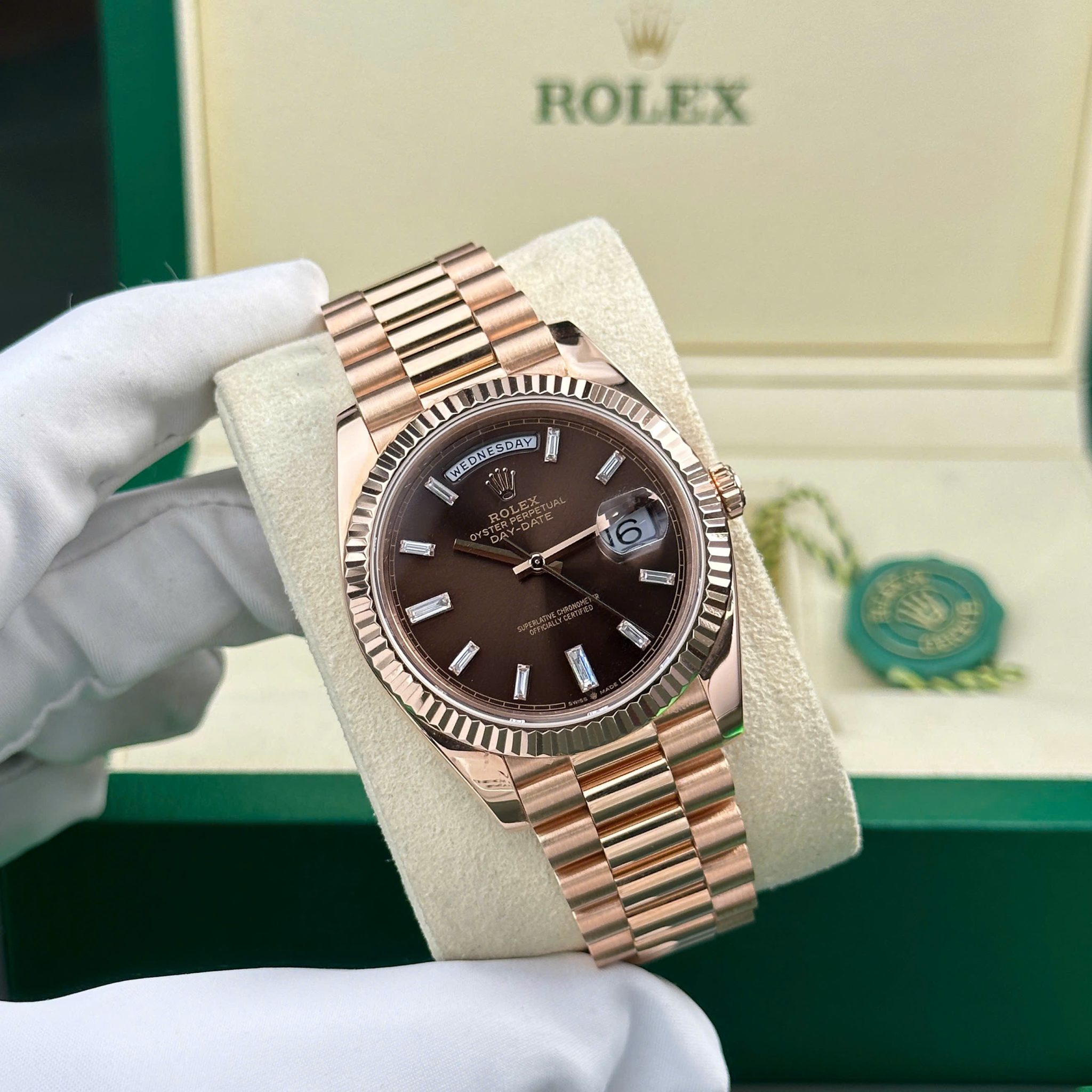 Rolex Day-Date 228235-0003 Chocolate Baguette Diamond Dial 18K Solid Rose Gold 40mm